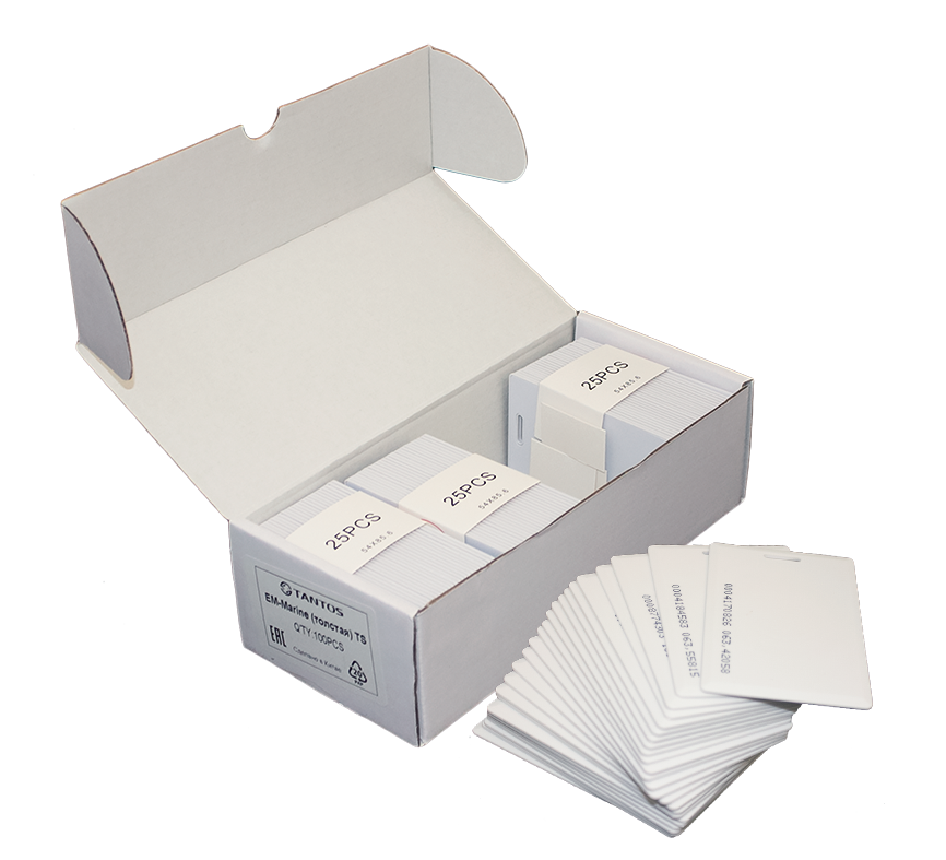 TANTOS EM-Marine (толстая) TS – бесконтактная карта доступа формата EM-Marin. Предназначена для идентификации пользователя в системе контроля доступа по коду, содержащемуся в конкретной карте. Выполнена в корпусе типа Clamshell с прорезью, габаритные размеры: 86x54x1,6 мм. Идентификационный номер нанесен на поверхность карты.